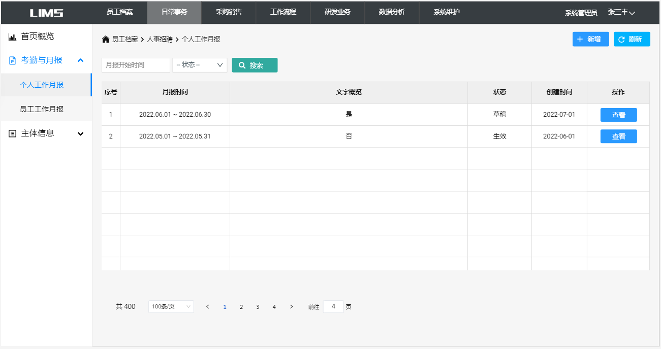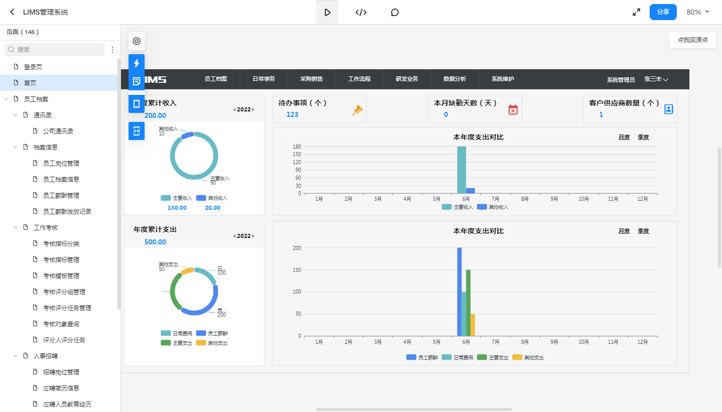 LIMS 原型进度汇报: 当前已完成了员工档案、日常事务 这两个模块。其他页面继续更新制作中。 原型的线上预览链接: