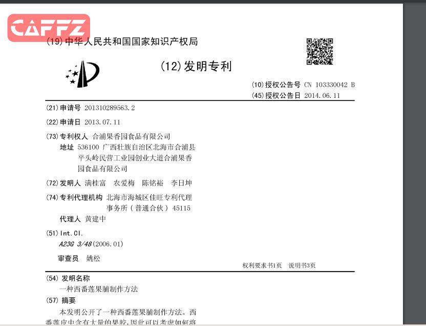 Abstract 本发明公开了一种西番莲果脯制作方法。西番莲皮中含有大量的果胶,因此可以考虑如何将带籽原浆和含有大量果胶的皮结合起来,制作果脯。本发明的具体技术步骤是:原料预煮,挖肉去壳,腌制,调酸,果片包浆,烘干、包装。采取上述措施的本发明,将加工后剩余的西番莲皮中含果胶的果片与外层的角质硬壳完整分离开,对西番莲果片和带籽原浆分别腌制,最后用两片果片包裹住果浆,烘烤成型,制得西番莲果脯。本发明创造性地用两片半球形的果片将液态带籽原浆包裹起来成球状,再烘烤成型,使得带籽原浆可被用于制作蜜饯果脯。本发明创意独到,味道鲜美独特,且由于加入了带籽原浆,比一般的果脯更具营养成分。 Description 一种西番莲果脯制作方法 技术领域 本发明涉及一种西番莲果脯制作方法,属于食品加工技术领域。 背景技术 西番莲是一种热带水果,果实酸甜可口,风味浓郁,芳香怡人。据测定,西番莲果实中含有由脂类、醛类、酮类、萜烯类等多种挥发性芳香化合物,以及多种人体必需的氨基酸、维生素和微量元素。丰富的芳香物质使西番莲最适宜被加工成果汁,素有“饮料之王”的美誉。目前西番莲在国内多以鲜食或榨汁为主,由于其果实内部为带籽液态原浆,难以被制成蜜饯果脯;而加工西番莲后剩余的西番莲皮则被用于饲养家畜,造成了很大了浪费。西番莲皮中含有大量的果胶,因此可以考虑如何将带籽原浆和含有大量果胶的皮结合起来,制作果脯。 发明内容 本发明所要解决的技术问题是提供一种西番莲果脯制作方法,利用西番莲加工后剩余的西番莲果皮,加入调配好的果浆进行加工制成果脯,解决了西番莲果皮的利用率低,西番莲中的果浆为液体胶状难以加工成果脯的缺点。 为了解决上述技术问题采用了以下技术措施,一种西番莲果脯制作方法,包括以下具体技术步骤: (1)原料预煮:在蒸煮容器中加入适量水,加热至沸腾,将西番莲果皮放入蒸煮容器中,水能全部没过西番莲果皮,待水重新沸腾后蒸煮10-12分钟,捞出,用自来水冲洗降温; (2)挖肉去壳:将西番莲果皮上的半球形果片与角质硬壳分离,收集果片,称量; (3)腌制:将果片与腌制辅料一齐按照下述重量份,置于桶中腌制: 果片8-12份 白砂糖2.5-4份 葡萄糖粉2-3份 麦芽糖浆2-3份 焦亚硫酸钠0.003-0.005份 食盐0.009-0.011份 柠檬酸钠0.004-0.006份; (4)调酸:腌制20-24小时,以柠檬酸调整总酸至0.8-1.2%,静置20-24小时,并使果片与腌制辅料均匀分布; (5)果片包浆:继续腌制65-72小时,将果片捞出,沥干糖水,每两片果片包裹住3-6克果浆;所述果浆由下述重量份原料配制而成: 白砂糖400-500份 西番莲带籽原浆350-450份 西番莲加糖果肉95-105份 菠萝浓缩汁10-20份 西番莲浓缩汁15-25份 卡拉胶5-10份 西番莲天然香精25-35份 焦亚硫酸钠0.5-0.8份; (6)烘干、包装:将包裹有果浆的果片放入烘箱进行烘烤,烘烤两次,第一次烘烤3-5小时,温度60-65℃,静置8-10小时回软,使水分重新分布均匀,第二次烘烤10-14小时,温度50-55℃,烘干至水分含量为14%-16%,待冷却后包装,即得。 所述的白砂糖、葡萄糖粉、麦芽糖浆、焦亚硫酸钠、柠檬酸钠、西番莲带籽原浆、西番莲加糖果肉、菠萝浓缩汁、西番莲浓缩汁、卡拉胶、西番莲天然香精都是市售商品。 采取上述措施的本发明, 将加工后剩余的西番莲皮中含果胶的果片与外层的角质硬壳完整分离开,对西番莲果片和带籽原浆分别腌制,最后用两片果片包裹住果浆,烘烤成型,制得西番莲果脯。对于西番莲的传统加工,一般是使用带籽原浆制作饮料或者饮料添加剂,西番莲皮则丢弃或饲养牲畜。本发明将西番莲皮中的果片与角质硬壳完整分离开来,得到半球形的西番莲果片,其中含有超过4%含量的果胶,是制作果脯的上好原料。西番莲的带籽原浆由于呈液态,难以被加工制作成果脯,本发明创造性地用两片半球形的果片将液态带籽原浆包裹起来成球状,再烘烤成型,使得带籽原浆可被用于制作蜜饯果脯。本发明创意独到,味道鲜美独特,且由于加入了带籽原浆,比一般的果脯更具营养成分。 具体实施方式 实施例1 (1)原料预煮:在蒸煮容器中加入2000 公斤水,加热至沸腾,将1000公斤西番莲果皮放入蒸煮容器中,待水重新沸腾后蒸煮10分钟,捞出,用自来水冲洗降温; (2)挖肉去壳:将西番莲果皮上的半球形果片与角质硬壳分离,收集果片,称量得果片800公斤; (3)腌制: 取果片800公斤、白砂糖250公斤、葡萄糖粉200公斤、麦芽糖浆200公斤、焦亚硫酸钠0. 3公斤、食盐0. 9公斤和柠檬酸钠0. 4公斤,一起置于容器中腌制24小时: (4)调酸:腌制24小时后,用柠檬酸调调整总酸为1.2%,静置24小时,早晚倒桶一次使果片与腌制辅料均匀分布; (5)果片包浆:继续腌制72小时后,将果片取出,沥干糖水,每两片果片包裹住3-6克果浆;所述果浆由下述原料配制而成: 取白砂糖40公斤、西番莲带籽原浆35公斤、西番莲加糖果肉9公斤、菠萝浓缩汁1公斤、西番莲浓缩汁1.5公斤、卡拉胶0.5公斤、西番莲天然香精2.5公斤和焦亚硫酸钠0.05公斤,上述原料混合均匀; (6)烘干、包装:将包裹有果浆的果片放入烘箱进行烘烤,烘烤两次,第一次烘烤4小时,温度60℃,静置8小时回软使水份重新分布,第二次烘烤12小时,温度50℃,烘干至水分含量为16%,待冷却后包装,即得。 实施例2 (1)原料预煮:在蒸煮容器中加入2000公斤水,加热至沸腾,将1000公斤西番莲果皮放入蒸煮容器中,水待水重新沸腾后蒸煮1