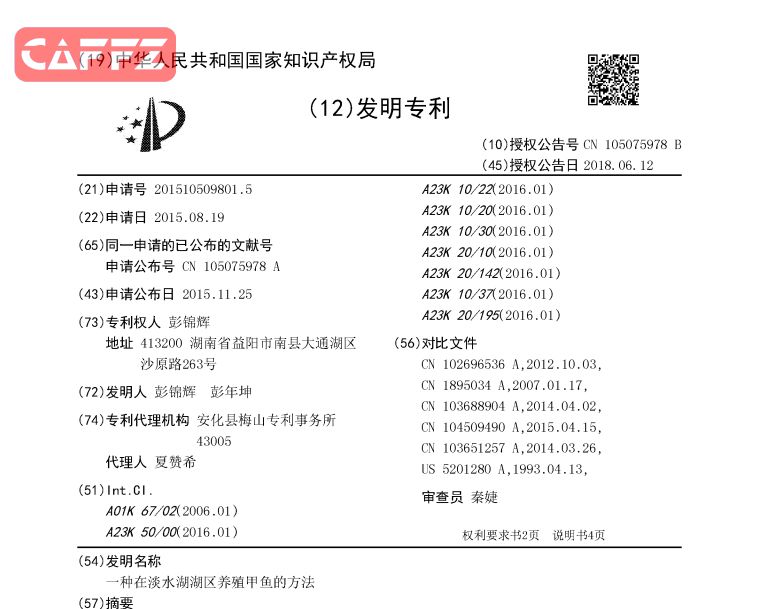 Abstract 一种在淡水湖湖区养殖甲鱼的方法,利用无污染或者低污染的重碳酸盐类钙组淡水湖作为养殖区修建养殖池,并将深井地下水与淡水湖湖水进行比例混合,将混合后的水体作为环境水体对甲鱼进行养殖,配合湖区原生的螺肉和蚌肉作为原料配合鸡蛋、大蒜素、五倍子和大黄粉配制饵料以促进甲鱼适应湖区环境,本发明的养殖方法管理方便、饲养容易、占地少、成活率高,提高了甲鱼的养殖收入便于实现甲鱼的规模化、产业化养殖。 Description 一种在淡水湖湖区养殖甲鱼的方法 技术领域 本发明涉及水产养殖领域中的甲鱼养殖技术,具体涉及一种在淡水湖湖区养殖甲鱼的方法。 背景技术 甲鱼是一种名贵的水产动物,盛产于湖泊、水库等水域,野生甲鱼味道鲜美,营养丰富,富含维生素A、维生素E,胶原蛋白、多种氨基酸、不饱和脂肪酸和微量元素,具有极高的营养价值,同时还具有滋阴补肾、清热消淤、健脾健胃等多种药用功效,可治虚劳盗汗、阴虚阳亢、久病泄泻、小儿惊痫、妇女闭经、难产等症,是我国消费者长期以来喜爱的药食同源食物,由于其在自然水域中遭到灭绝性捕捞,野生甲鱼资源日益枯竭,湖泊等水域野生甲鱼极为罕见,因而,人工养殖的甲鱼成为了其绝佳替代品。 随着人们生活水平的提高,对甲鱼的需求增加,各种养殖方式也相继出现如小水泥池、池塘、大棚控温养殖,这些养殖方法虽然提高了甲鱼产量,但因投入高,管理技术难度大,且生长缓慢,同时,由于其养殖区域密度高,使用饲料又多为低品级的加工饲料,导致其肉质较差,营养成份的种类和含量也远低于野生甲鱼,因而有必要开发出一种经济效益好且能综合利用有效资源的生态甲鱼养殖方法。 发明内容 本发明所解决的技术问题在于提供一种在淡水湖湖区养殖甲鱼的方法,用以解决上述技术背景中的缺陷。 本发明所解决的技术问题采用以下技术方案来实现: 一种在淡水湖湖区养殖甲鱼的方法,具体包括以下操作步骤: 1、选取无污染或者低污染的重碳酸盐类钙组淡水湖作为养殖区,选择在水体边缘水质清澈、光照透彻的区域砌筑多个养殖池,养殖池为砖混结构,单个池子面积20㎡~30㎡,池深1.5~2m,池内为两阶结构,其上阶与下阶的高度差为1.0~1.3m,上阶上设置有开有一个深度为0.2~0.4m、大小与上阶一致的凹槽,另外,在上阶与下阶之间还砌筑有一个斜坡,此斜坡与池底呈20°~30°的斜角。 2、将砌好的养殖池清洗、消毒,并引湖水浸池1~2个月,然后将湖水放干,并再次清洗、消毒,消毒完成后将养殖池冲洗干净,并在上阶槽内填满干净、消毒好的细砂备用。 3、将深井水与湖水1:2~1:3的比例混合后将水体总硬度和总碱度及氯化物、硫酸盐、硅酸盐、氨态氮指标控制在渔业用水标准之内,然后对养殖池进行引水,甲鱼苗首先在保持4~6cm的浅水位养,以后随个体增大加深水位但不应超过0.8m,此过程中控制水温26℃~32℃;然后选取健康的甲鱼鱼苗,利用2㎎/L的硫酸铜或者高锰酸钾溶液对鱼苗进行体表擦拭后在1mg/L的相同溶液中浸泡30min,然后按照10~15只/㎡的标准向养殖池投放鱼苗。 4、利用毗邻的淡水湖原产的螺、蚌作为主原料配制饵料,螺和蚌当天或者提前一天打捞,将打捞的螺、蚌分别进行碎壳处理,并将螺肉去肠与蚌肉一同进行分选,洗净,然后按螺肉和/或蚌肉:鸡蛋:大蒜素:五倍子:大黄粉=50:10:1:2:1的比例添加鸡蛋、大蒜素、五倍子、大黄粉配制成日常饵料;另外,在日常饵料中分别添加占总饵料质量0.01%~0.05%的脯氨酸、0.01%~0.05%的羟氨酸、0.01%~0.05%的丝氨酸、0.05~0.1%的瓜氨酸以及0.3%~0.5%的麸皮、玉米粉和0.1~0.3%的土霉素即为产卵期和冬眠前期饲料。 5、利用上述饵料对养殖池中的甲鱼进行投喂:5月~10月上旬每天投喂2~3次,投喂两次的投喂时间为每天的8点和16点、投喂三次的投喂时间为每天的8点、12点以及18点,日投喂量为甲鱼体重的5%~7%,而其他时间段每天投喂一次,投喂时间为每日的8点,日投喂量为甲鱼体重的3%~5%;每年的11月上旬开始到第二年5月为甲鱼的冬眠期,不需要喂食。 6、甲鱼进入冬眠期后,在养殖池区域修建隔离带,不要让人畜在养殖池边经常走动,以免使甲鱼受到外来的惊吓,影响甲鱼的正常冬眠,苏醒以后的甲鱼通常都会有一段时间的静止期,保持光照至能正常活动即可。 在本发明中,所述养殖池池体内下阶上设置有若干固定的竹片织成的三角锥台,此三角锥台的高度为0.8~1m,以方便甲鱼活动以及探头。 在本发明中,所述养殖池池体内上阶上设置有若干固定的喂食盘,饲养过程中未吃完的残饵应及时清除,并用消毒液清洗食台。 在本发明中,每隔30天对养殖池定期利用食盐水、二氧化氯、溴氯海因进行水体消毒,消毒处理后调节水质,并用溴氯溶剂对甲鱼体表进行擦拭。 在本发明中,养殖池保持0.5m/s~1m/s的速度流动供水以防止水体腐败变质。 在本发明中,甲鱼在冬眠前和产蛋前15天开始,饵料的投喂量适当增加至平时投喂量的1.2~1.5倍,且在此期间保持养殖区域安静,不要让甲鱼受到惊吓。 在本发明中,需要在不同时期对养殖池内的甲鱼进行密度调整处理,其中:2龄50~100g时为10~15只/㎡;3龄100~200g时5~8只/㎡;4龄400~500g时3~5只/㎡;5龄600g以上时1~3只/㎡,且在4龄及5龄阶段,每个养殖池内雌雄鳖的比例应控制为5:2~3:1。 有益效果:本发明充分利用了淡水湖湖区资源以及甲鱼生长发育规律,整个养殖过程操作简单,投入